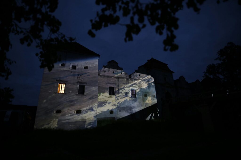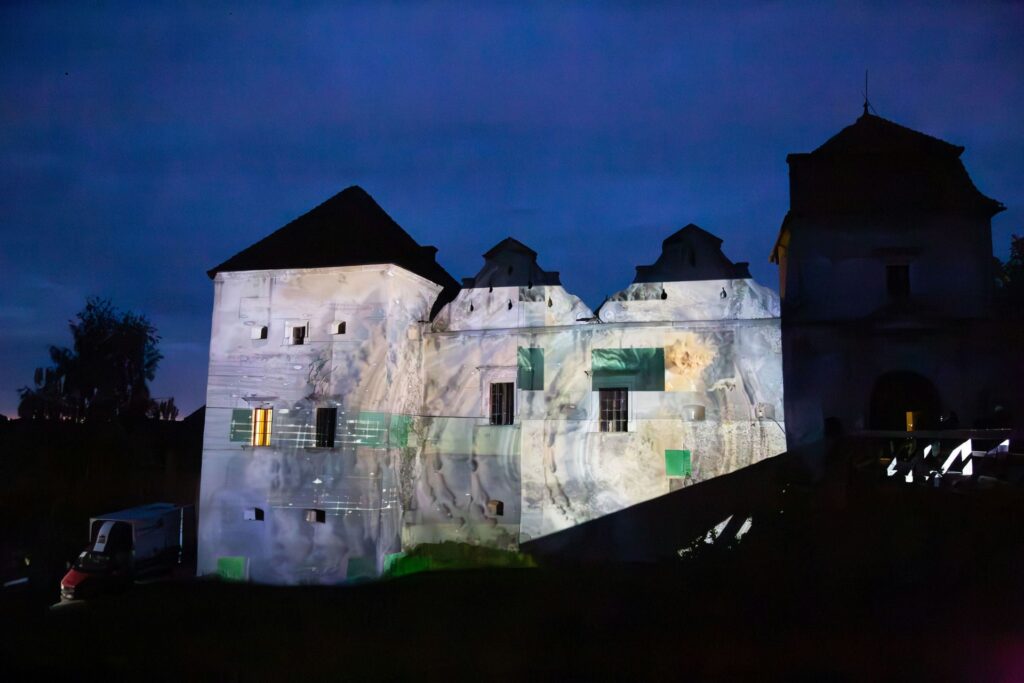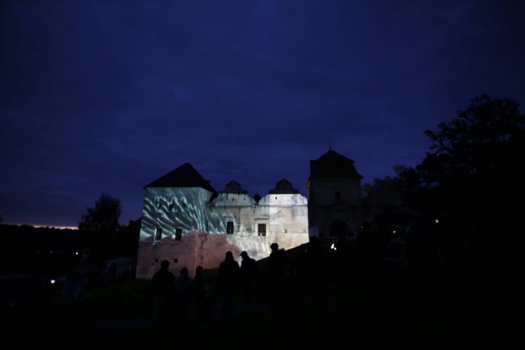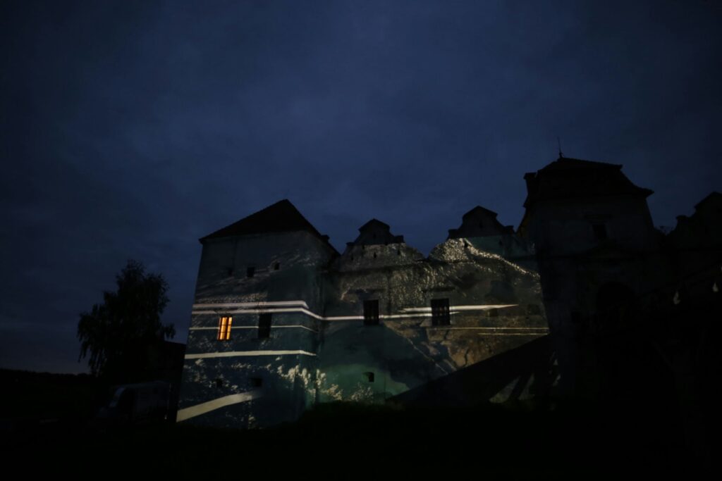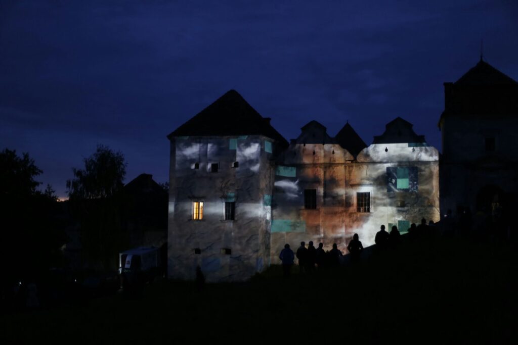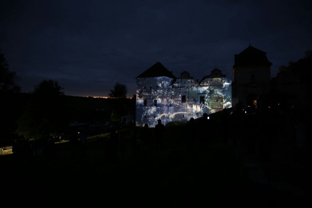 „Zamek Świrz zamienił się w żywe płótno dzięki mappingowi. Artysta — znany z multimedialnych instalacji i performansów łączących sztukę, technologię i narrację społeczną — stworzył hipnotyzującą projekcję „The Elements / FREE UKRAINA / FREE IMPROVISATION”, która zamknęła trzeci dzień wydarzenia.